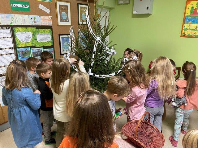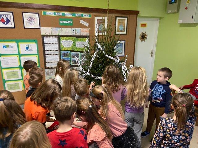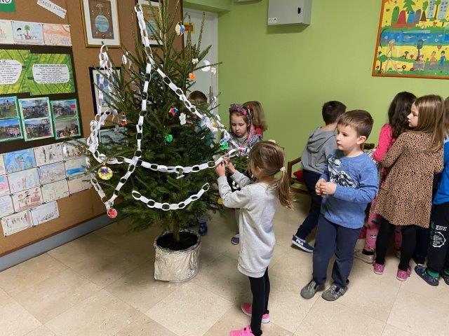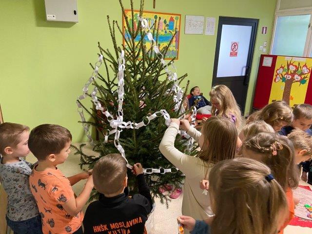Djeca starije A i C skupine okitili su božićnu jelku u predvorju objekta Maslačak. U suradnji s gospođom Katarinom Žagar koja nam je darovala bor ukrasili smo naš vrtić. Bor su djeca okitila ukrasima od gipsa i bombončićima koje su izradili na radionici u Muzeju Moslavine i u vrtiću.