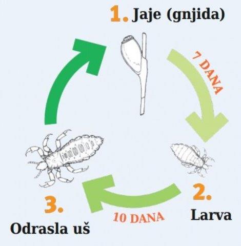 U životu uši razlikujemo tri razvojne faze: gnjida (jajašce), larva (nimfa) i spolno zrela uš (slika 2.). Gnjida je sitno jajašce veličine oko 1 mm, čvrsto prilijepljeno uz kosu. Iz nje se nakon 7 dana izleže larva koja postaje nakon 10 dana spolno aktivna zrela uš. Odrasla ženka tokom svog života koji traje oko 2 mjeseca, iznese oko 200 do 300 jajašca. Odlaže ih uz korijen kose, najčešće uz vrat i iza uha. Ako se gnjida ne odstrani ručno, dugotrajnim iščešljavanjem ili prstima, larve i odrasle uši mogu prijeći na drugu osobu.