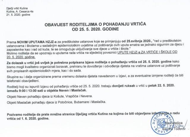 OBAVIJEST ZA RODITELJE O RADU VRTIĆA 25. 5. 2020. GODINE 21.5.2020. NOVE UPUTE HZJZ OD 20.5. 2020. GODINE PROTOKOL ZA BORAVAK DJETETA U VRTIĆU OD 25. 5. 2020. GODINE
