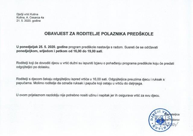 OBAVIJEST ZA RODITELJE ČIJA SU DJECA POLAZNICI PROGRAMA PREDŠKOLE 22.5.2020. iZJAVA RODITELJA O POHAĐANJU PROGRAMA PREDŠKOLE