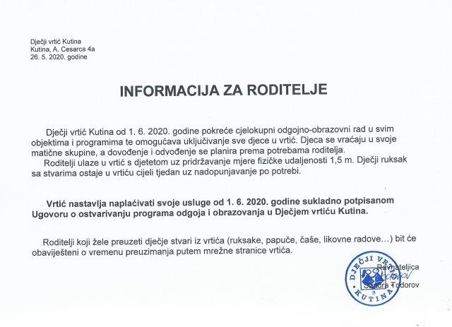 INFORMACIJA ZA RODITELJE O RADU VRTIĆA OD PONEDJELJKA 1. 6. 2020. GODINE 26.5.2020. PREPORUKE MZO-a ZA RAD S DJECOM RANE I PREDŠKOLSKE DOBI U VRTIĆU UPUTE HZJZ-a ZA SPRJEČAVANJE I SUZBIJANJE EPIDEMIJE COVID-19