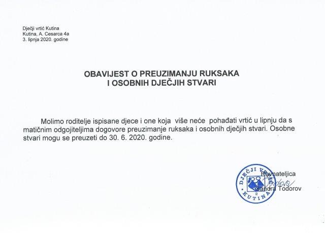 OBAVIJEST RODITELJIMA O PREUZIMANJU RUKSAKA I OSOBNIH DJEČJIH STVARI