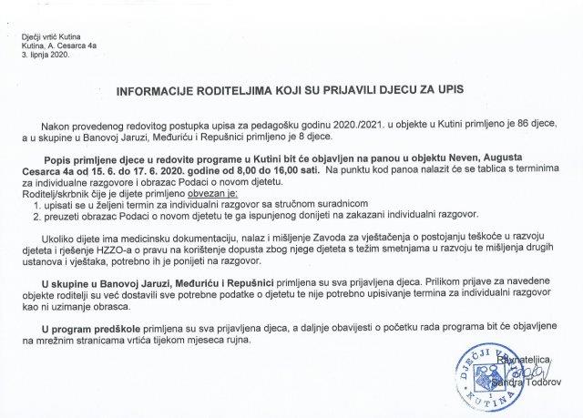 INFORMACIJE RODITELJIMA KOJI SU PRIJAVILI DJECU ZA UPIS