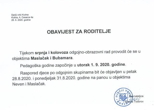 OBAVIJEST ZA RODITELJE O RADU LJETI