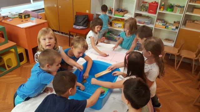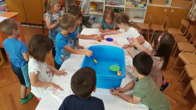 Djeca mlađe A skupine Maslačka i srednje B skupine Nevena istraživali su koji predmeti plivaju, a koji tonu u vodi. Djeca su i sama donosila igračke i predmete koje su pronašli u sobi te su svoje rezultate bilježili na plakatu PLIVA - TONE.