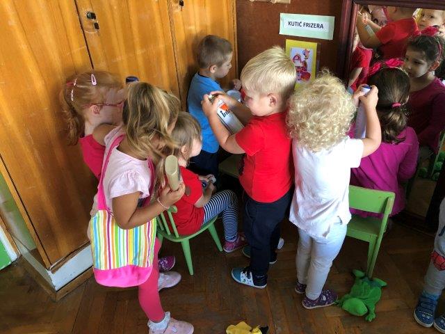 Djeca mlađe skupine objekta „Neven“ uživaju u sobi punoj igračaka i materijala koje svakodnevno istražuju. Najviše interesa pokazuju za imitativnu igru u kutiću frizera, gdje prave frizure jedni drugima te se izmjenjuju u ulozi frizera. Interes za igru je velik te se proširio i na terasu za vrijeme boravka na zraku. Potaknuti interesom djece dopunjujemo i mijenjamo predmete pogodne za imitativnu igru.