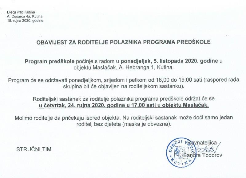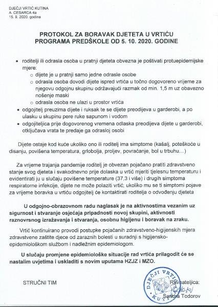 OBAVIJEST ZA RODITELJE PROGRAMA PREDŠKOLE 16.9.2020. PROTOKOL ZA BORAVAK DJETETA U VRTIĆU PROGRAMA PREDŠKOLE MODELI I PREPORUKE ZA RAD U UVJETIMA POVEZANIMA S COVID-19