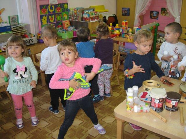 Djeci jasličke skupine „Košuta“ bilo je veoma zanimljivo izrađivati zvečke. Strpljivo su punila zrnje kukuruza u bočice, čvrsto smo zatvorili zvečke i s njima se igrali i zveckali. Ponudile smo i druge dječje glazbene instrumente, što je djecu oduševilo, s batićima su udarala po bubnjevima od limenke, a pokušavali su svirati na gitari i maloj harmonici.