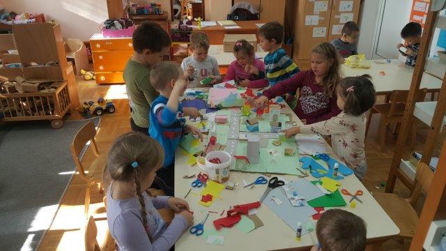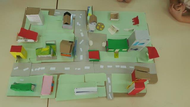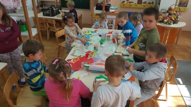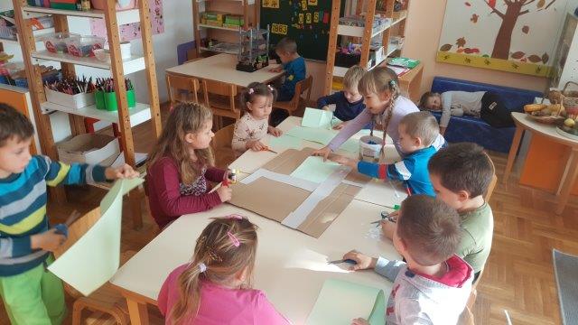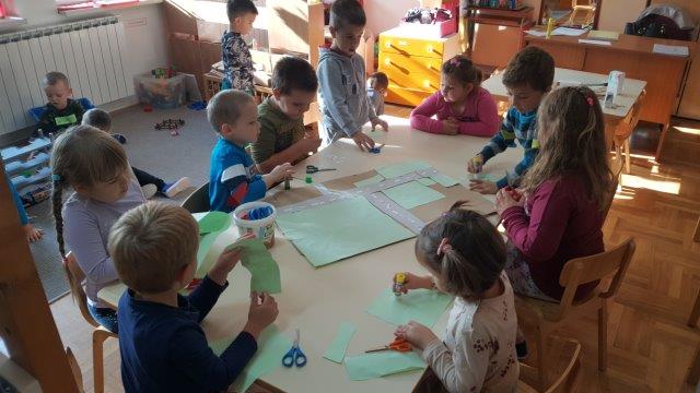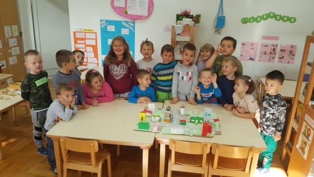 Sitnim i krupnim građevnim materijalom djeca su gradila svoje kuće ili dijelove sela. Od kutijica, papira, kolaž papira i kartona te uz pomoć škarica i ljepila izradili smo maketu sela. Prvo su razmišljali i dogovorili kako bi bilo najbolje napraviti raskrižje u blizini vrtića jer bi onda mogli napraviti dio Međurića u kojem živi najveći broj djece iz skupine i dio Velikog Vukovja u kojemu živi dio djece iz skupine. Vrlo dobro su surađivali i spontano se uključivali u aktivnost.