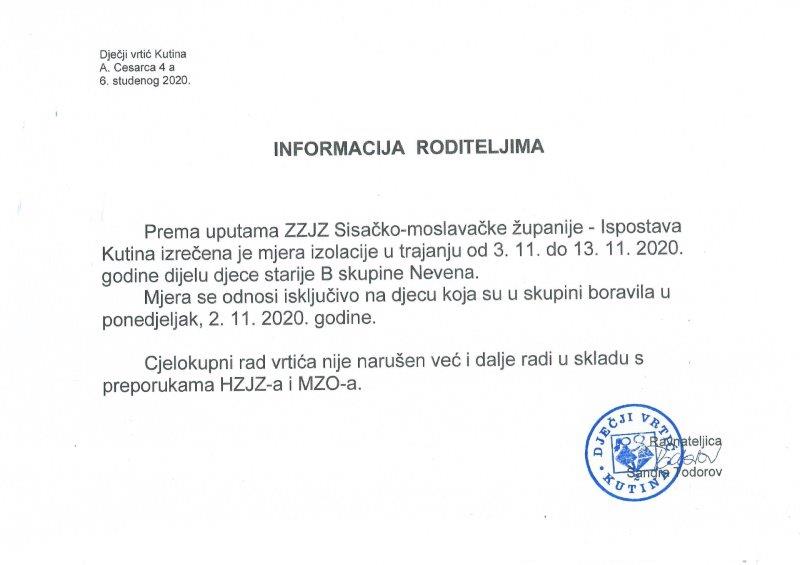 INFORMACIJA ZA RODITELJE - IZREČENA MJERA SAMOIZALCIJE 6.11.2020. DOPIS MZO-a ZA RODITELJE - SAMOIZOLACIJA ZA VRTIĆE I ŠKOLE -
