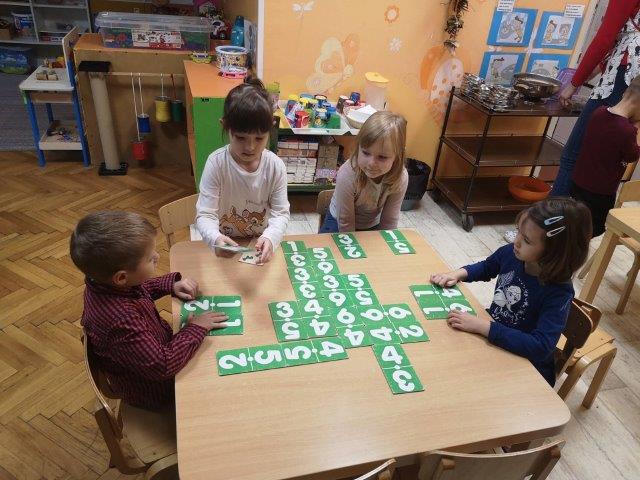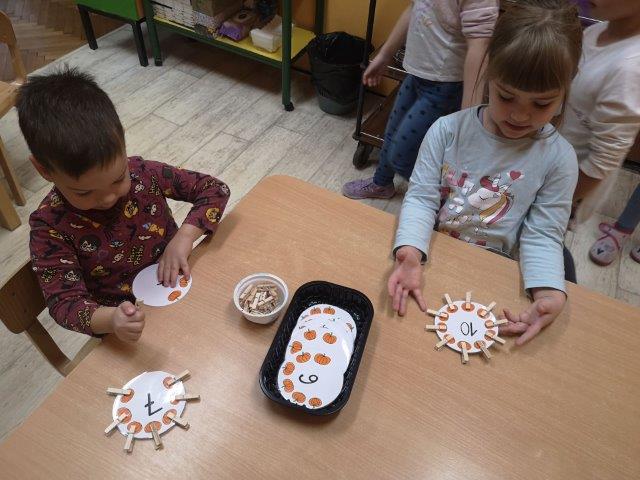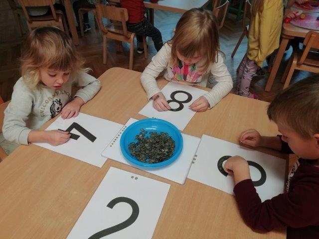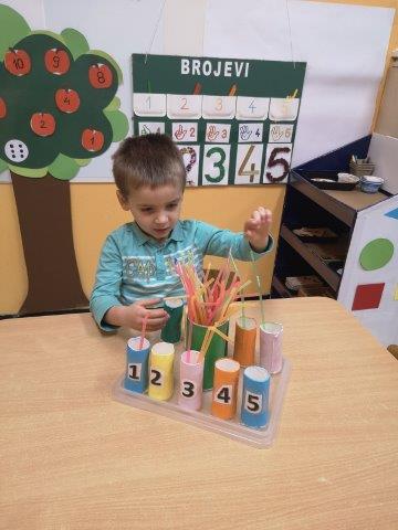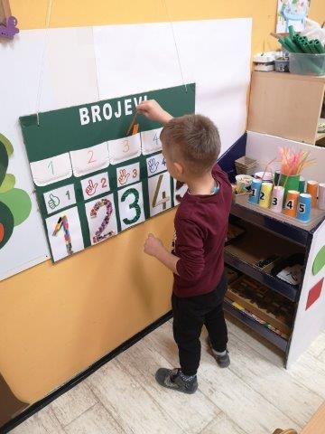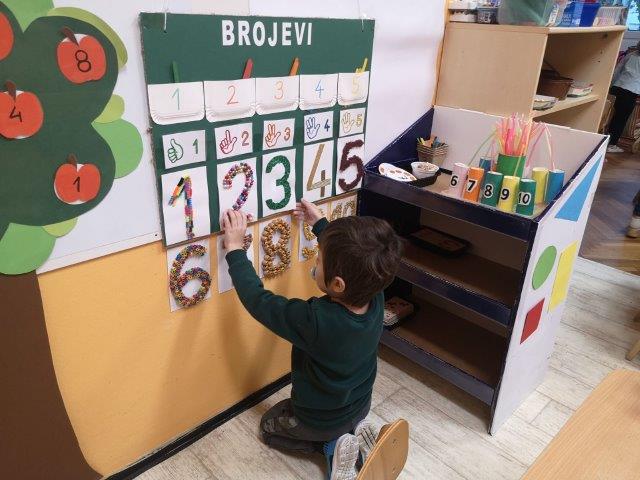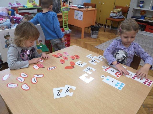 Djeca srednje B skupine objekta Maslačak pokazala su veliki interes za brojeve zbog čega smo u našoj skupini oformili matematički kutić. Opremili smo ga raznim matematičkim igrama i poticajima. Djeca su rado sudjelovala u igri „Domino“ u kojoj su brojila točkice i prepoznavala brojeve, umetala su slamke u papirnate tuljce s obzirom na količinu, pridruživala su polovice jabuka s količinom koštica i pripadajućim brojem. Košticama bundeve ispunjavali su brojeve na plastificiranom predlošku te su uz pomoć drvenih kvačica označavali bundeve uz brojenje. Izradili smo interaktivni plakat s umetanjem drvenih špatula prema broju te taktilne brojeve koje djeca svakodnevno isprobavaju. Za djecu koja su pokazala interes za računske operacije, ponuđene su „Puzzle“ za zbrajanje, a posebno ih se dojmila igra pridruživanja „Matematičko drvo“. Osim igara u matematičkom kutiću svakodnevno smo brojili igračke, stolove i stolice u našoj skupini. Igru brojevima proširili smo i na boravak na zraku tako što smo brojili drveće, sprave na igralištu te korake (koliko koraka ima od jednog do drugog drveta i slično). Kroz navedene aktivnosti djeca su prepoznavala i imenovala brojeve te povezivala broj i količinu do 5, a zatim i do 10.