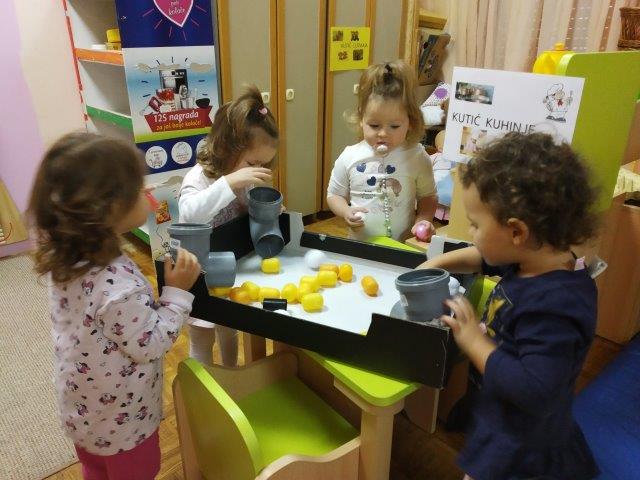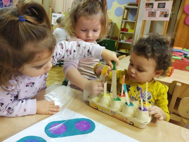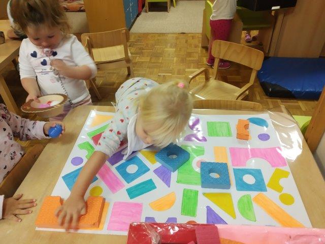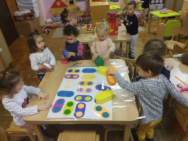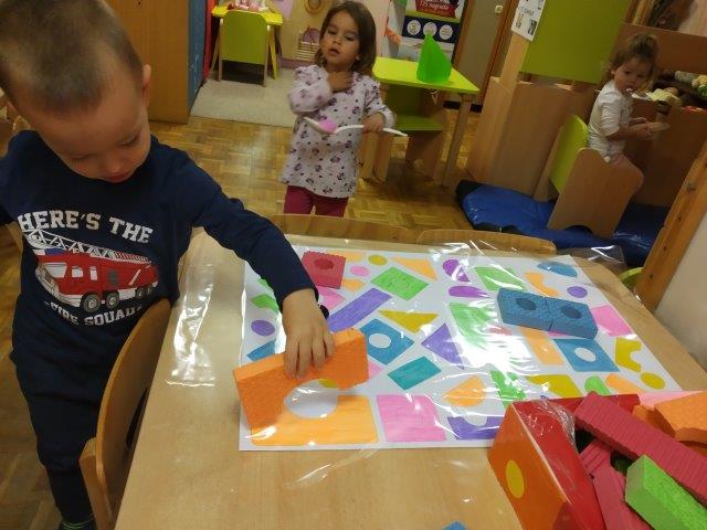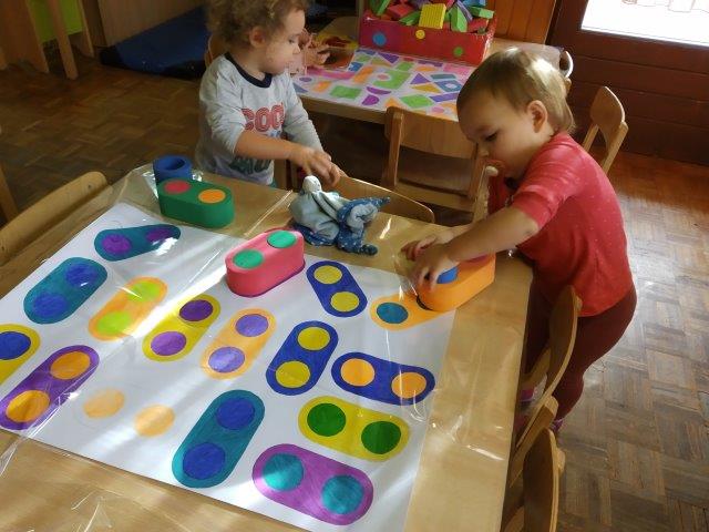 Kod djece naše skupine primjećen je interes za istraživanjem boja, oblika i prostornih odnosa te smo djeci omogućile raznovrsne poticaje, didaktičke i igre pedagoški neoblikovanim materijalom. Tako smo već postojeće spužvaste elemente kojima su djeca gradila i nizala iskoristile kao elemente za Pokrivaljke bojama i oblicima. Na hamer papire smo nacrtale i obojale iste takve oblike, smjestile ih na stolove pod plastične zaštite koje se mogu brisati. Kutije sa većim spužvastim elementima smo smjestile podalje od stolne igre kako bismo djeci omogućile slobodno kretanje za vrijeme igre i stajanje oko stola, aktiviranje akomodacije oka i dr...