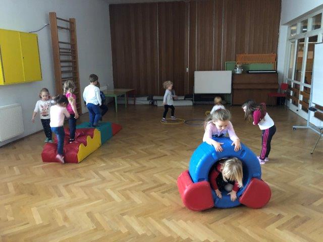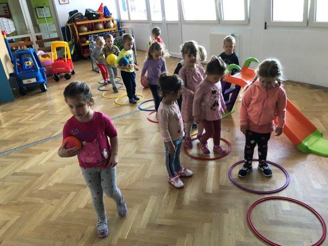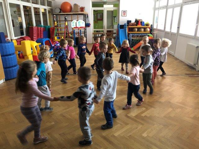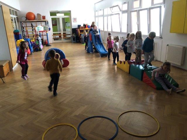 Djeca mlađe skupine Nevena vesele se boravku i igrama koje provodimo u dvorani, a posebno različitim načinima kretanja preko malog poligona gdje djeca pokazuju svoju spretnost. Rado plešu uz dječje igre s pjevanjem poput „Igra kolo“, „Ide maca oko tebe“, „Mi smo djeca vesela“. Proveli smo i aktivnost „Ptičice u gnijezda“ gdje smo vježbali poštivanje pravila. Tjelesnim vježbanjem razvijaju koordinaciju, ravnotežu, preciznost, pokretljivost i spretnost u prirodnim oblicima kretanja te zadovoljavaju svoju prirodnu potrebu za kretanjem.