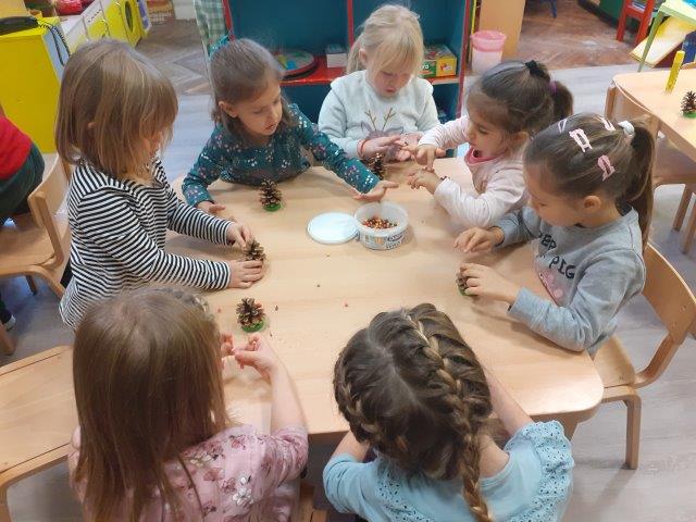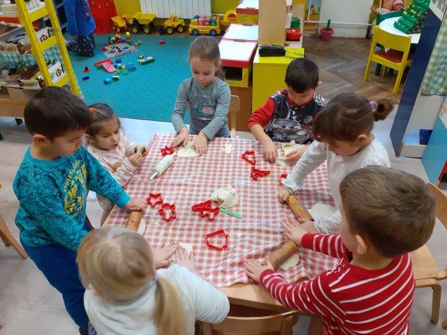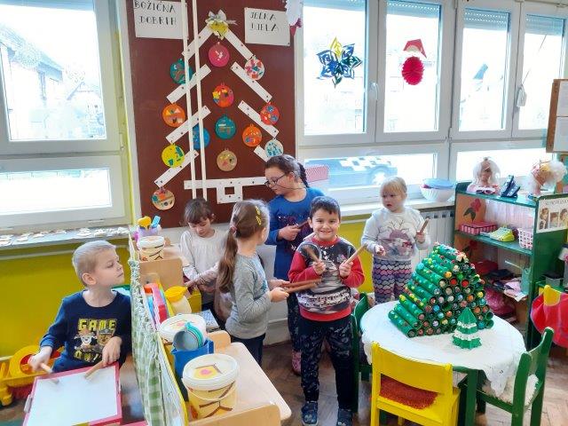 Izrađivala su malene božićne jelke koristeći češere i kuglice u bojama, oslikavala čestitke akvarelom, a tehnikom kolaža izradila kuglice. Kuglice su poslužile za izradu jelke dobrih djela. Razgovarala su: „Što su to dobra djela?, Na koji način mogu i ja učiniti dobro djelo za mamu, tatu, prijatelja...?“ Od slanog tijesta izrađivala su kolačiće koje koriste u igrama pretvaranja u kutiću kuhinje, a kako bi stvorila ugodno, veselo i svečano ozračje blagdana, pjevala su, plesala i svirala uz pjesmicu Din, din, don.