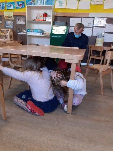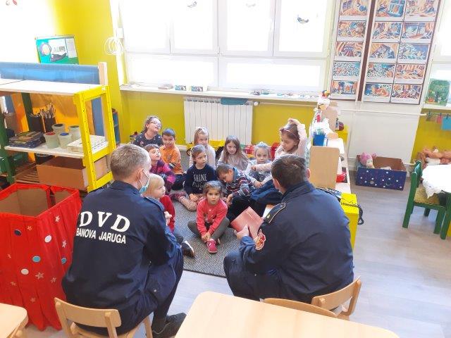 U suradnji s Osnovnom školom i Dobrovoljnim vatrogasnim društvom Banova Jaruga uvježbavali smo načine sigurnosnog i samozaštitnog načina ponašanja u slučaju potresa. Posjetili su nas zapovjednik dobrovoljnog vatrogasnog društva, Alen Pecko i operativni član Renato Čar. Kroz razgovor smo saznali zašto potresi nastaju, koji su načini na koje se možemo zaštititi, zašto se za vrijeme potresa ne smije trčati iz zgrade, ali i koliko je važno slušati upute odraslih u tom trenutku.Uvježbavali smo sakrivanje pod stolove, čučanje ili sjedenje na wesco elementima uz nosivi zid te način izlaska iz zgrade kada zemlja prestane podrhtavati.