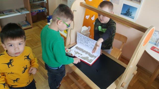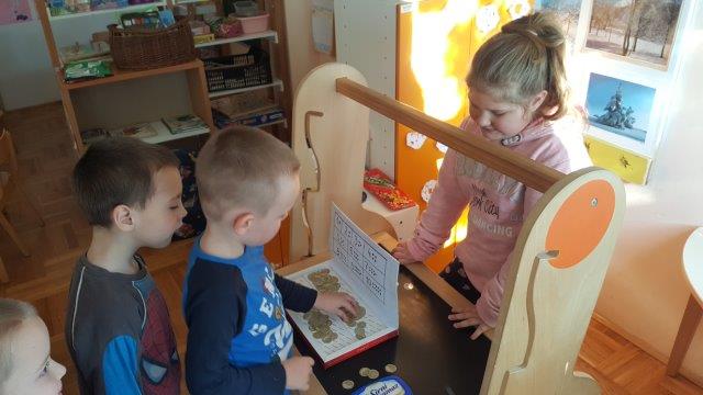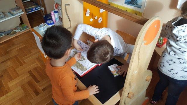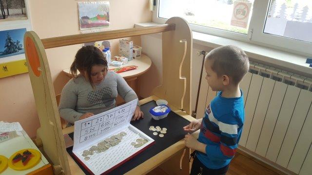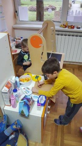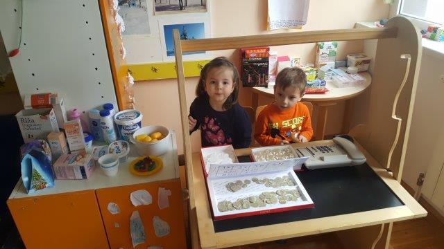 Djeca u objektu Leptirić su, uz pomoć odgojiteljice, osmislila prostor u kojemu smo oformili kutić trgovine. Izradili smo blagajnu i osmislili sustav plaćanja, a uz suradnju s roditeljima napunili police u trgovini. U ovoj igri pretvaranja cilj je prebrojiti određenu količinu novčića za određeni proizvod. Kako bi u tome bili što uspješniji, na blagajni se može jasno vidjeti broj i pripadajući simboli (točke). Prodavač kontrolira izbrojeni novac prebrojavanjem te izdaje račun za kupljeni proizvod. Kako bi znali što sve imamo, ali i što nam još nedostaje u trgovini, djeca su prebrojala artikle po vrsti i napisala količinu na papir. Količinu su pisali brojevima ili simbolima (točkama). Cijene pojedinih artikala su izražene crtežom artikla i brojem/simbolom novčića, a one koje još nisu izrađene odredi prodavač u trgovini. Osim matematičkih, kroz igru se usvajaju socijalne vještine kao što su društvene norme (pozdraviti, zahvaliti se, zamoliti,...), suradnja i dogovaranje s prijateljima u skupini.