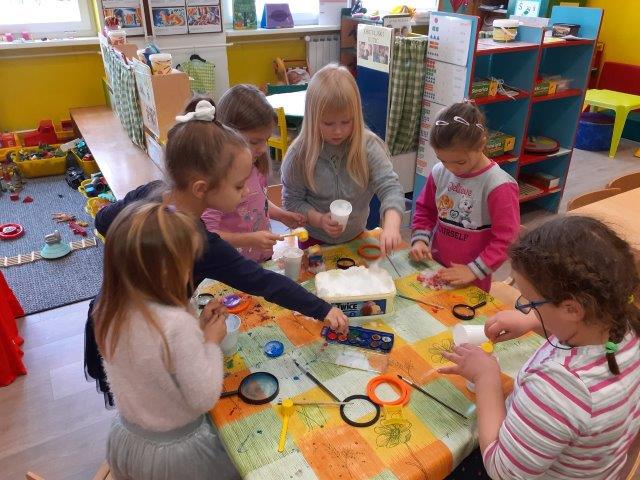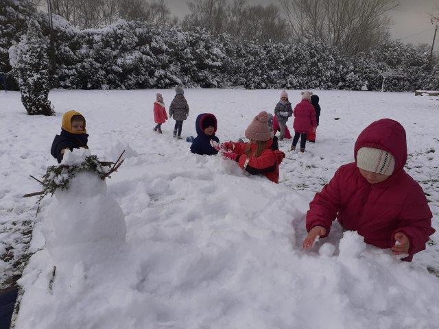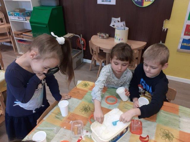 Nakon grudanja i izrade snjegovića na igralištu, djeca su istraživala što se još može izraditi od snijega. Promatrala su ga kroz povećala te opisivala njegov izgled i osjećaj koji nastaje kada se igraju s njim... Nakon promatranja počela su ga oblikovati. Nastajale su ledene skulpture koje su odlučila oslikati akvarelom. Idući dan su uočila kako su se njihove skulpture rastopile, a voda koja je preostala bila je obojana. Zaključila su kako se snijeg pod utjecajem topline topi, ali da se osim grudanja, sanjkanja i izrade snjegovića, može i na taj način igrati s njim.
