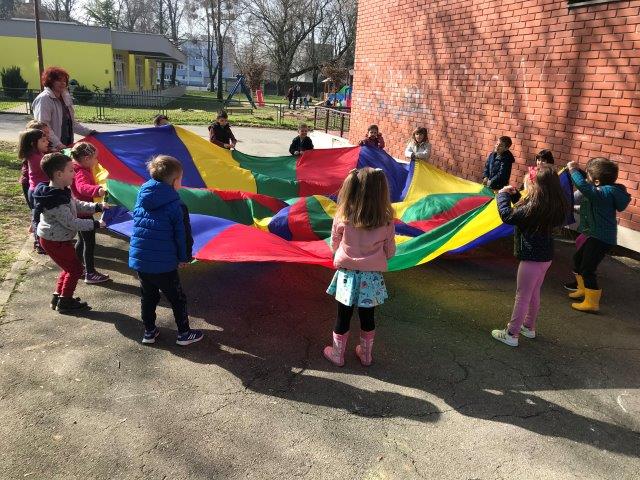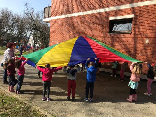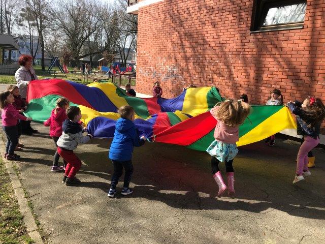 Igre na otvorenom djeci nude dodatan prostor za istraživanje, kretanje i učenje. S dolaskom ljepšeg vremena djeca srednje „A“ skupine Maslačka igrali su razne igre na otvorenom. Jedna od djeci najzanimljivijih je igra „Padobran“ koju smo igrali na razne načine (podizanje, spuštanje, skrivanje ispod padobrana, loptice putuju i skaču i dr.)