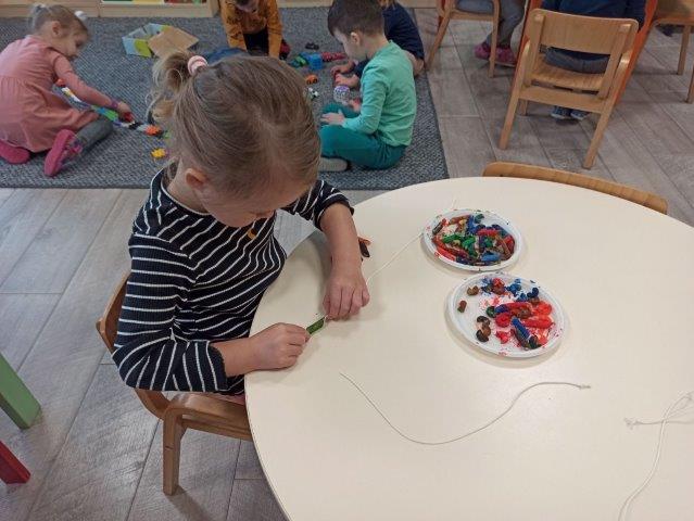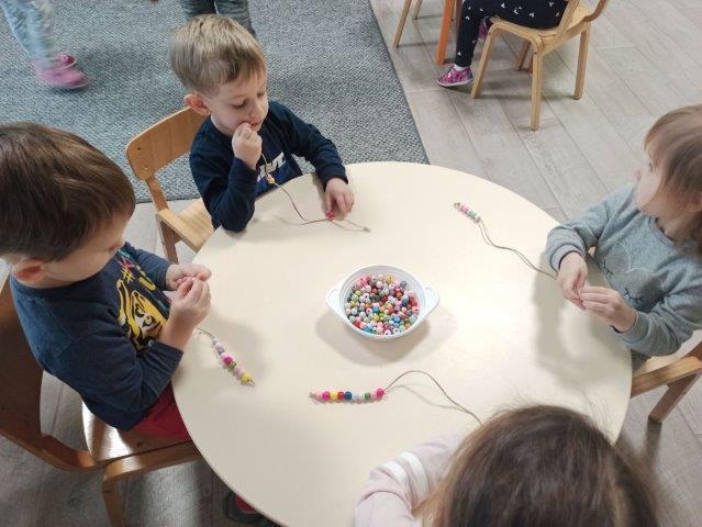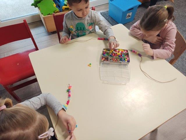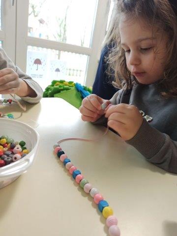 Djeca mlađe B skupine su se odlučila zabaviti i napraviti svoju ogrlicu. Tjesteninu različitih oblika su bojali temperom, a zatim su špagu provlačili kroz tjesteninu, nizali i napravili svoje ogrlice. Ova aktivnost potiče razvoj fine motorike, ustrajnost, koncentraciju i kreativnost.