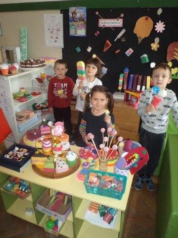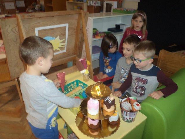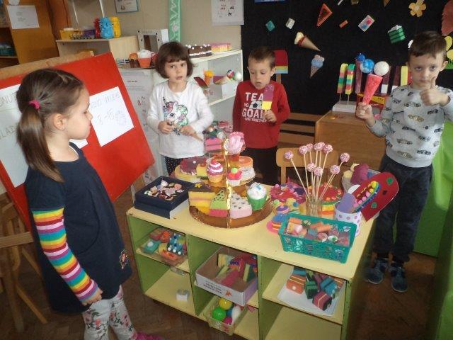 U srednjoj B skupini oformili smo novi kutić za igru „Mala slastičarnica”. Potaknuti dječjom idejom započeli smo igre kupovine sladoleda i odabiranja najdražih okusa. Predložili smo djeci i roditeljima da pokušaju kod kuće zajedno izraditi pokoju slasticu i da nam donesu u vrtić za igru. Kao i uvijek, roditelji su bili spremni na suradnju i odazvali se na predloženu ideju u velikom broju. Danima su nam donosili raznovrsne rukotvorine kojima smo pojedinačno pridavali važnost, a posebno djeca koja su sudjelovala u izradi. Ova igra se svakodnevno provodi u našoj skupini, a njome djeca razvijaju pozitivne socijalne odnose i vještine.