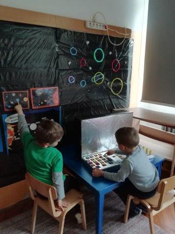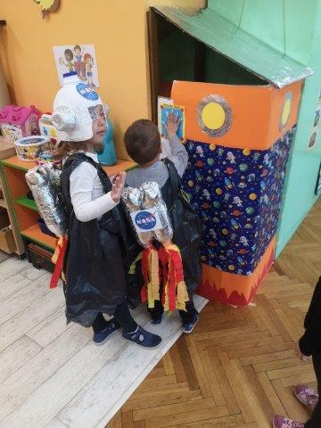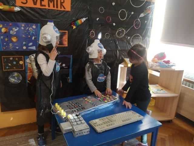 Obilježavanje Dana planeta Zemlje potaknulo nas je na istraživanje gdje se nalazi naš planet u Sunčevom sustavu. Zanimalo nas je kako svemir izgleda i što se sve u njemu nalazi. Istraživanje smo započeli listanjem i promatranjem enciklopedija te gledanjem edukativnog videa nakon čega smo odlučili stvoriti novi kutić u našoj sobi – kutić svemira. Novi kutić svakodnevno smo nadopunjavali novim materijalima čime je igra postajala složenija i bogatija. Dodavajući nova sredstva za igru nastala je svemirska postaja uz koju smo napravili i kartonsku raketu za igru. Djeca su pokazala veliki interes za imitativnu igru u kojoj rado preuzimaju i uživljavaju se u uloge astronauta i kontrolora leta rakete. Ovim sklopom aktivnosti nastojali smo zadovoljiti dječju znatiželju i interes za svemir. Veselimo se novim pustolovinama koje nas čekaju na našem svemirskom putovanju.