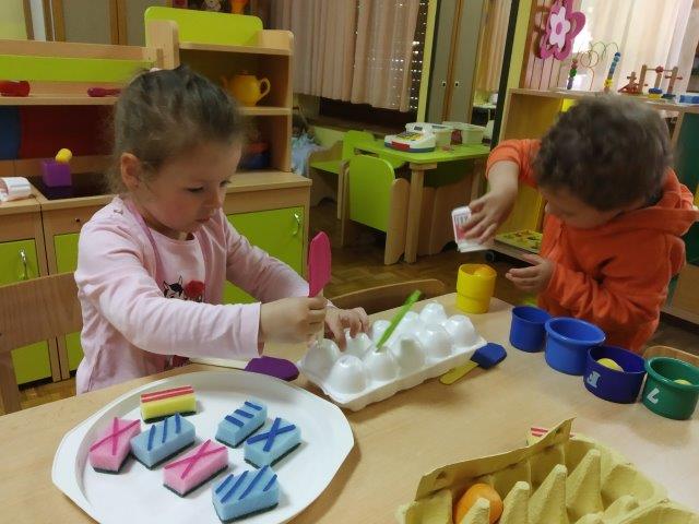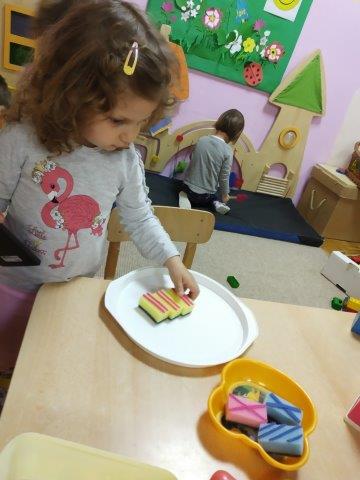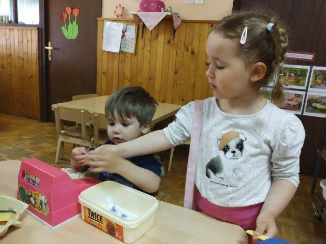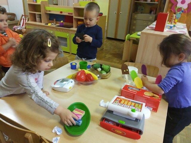 U zadnjih nekoliko tjedana djeca su pokazala interes za igrama pretvaranja, osobito igrom slastičarnice. Pokretač za ovaj mali projekt su bile situacije razmjene novčanica prilikom prodaje Leptirića. Djeca su počela bojati papiriće koji su im predstavljali kovanice, kune. Zatim je krenula igra trgovanja voćem i povrćem iz kutića kuhinje, a na upit što bi najviše voljeli prodavati odgovor je bio skoro jednoglasno: Sladoled! Tako smo novonastali kutić trgovine obogatili novim poticajima, mnoštvom filcanih sladoleda, ali i spužvastih kolača pa je trgovina postala slastičarnica. Izradili smo dovoljno novaca, pripremili kasice, torbice i novčanike za igru. Djeca su ostvarivala bogate interakcije, osobito ona koja se inače više igraju individualno. Sva djeca su surađivala, imenovala vrste sladoleda, nabrajala od čega su kolači. Primjetile smo i kombiniranje materijala u igri, didaktičkih i izrađenih, što je obogatilo igru dodatno. Djeca su sladolede u boji razvrstavala u kocke prema istoj boji koje su služile kao stalci za sladolede. Kolače su razvrstavali prema vrsti i izgledu. U skupini vlada ugodno i veselo ozračje, a igra se nastavlja.