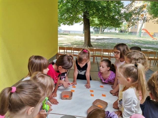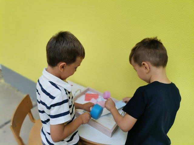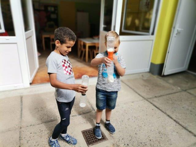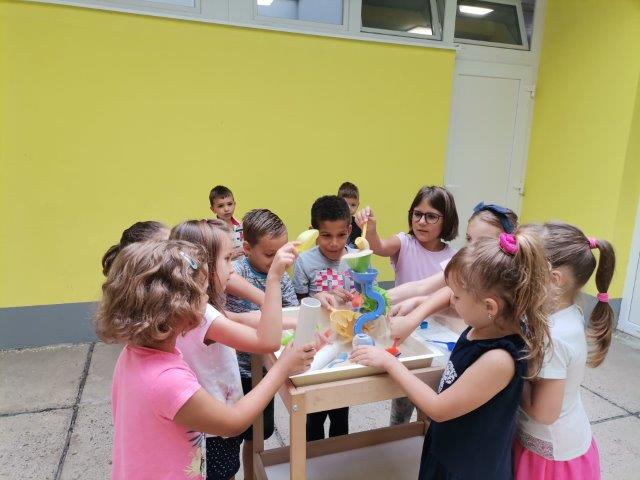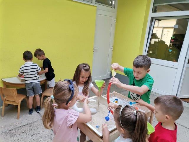 Za ugodniji i zanimljiviji boravak ljeti u vrtiću najviše se vremena provodi u igrama na zraku. Djeca eksperimentiraju različitim igračkama i svakodnevno dostupnim materijalima. Kako bi kod djece potakli interes za istraživanjem i manipuliranjem ponudili smo im pijesak i druge rastresite materijale uz mnoštvo različitih bočica, lijevak, plastičnih crijeva i dr.