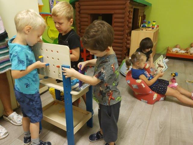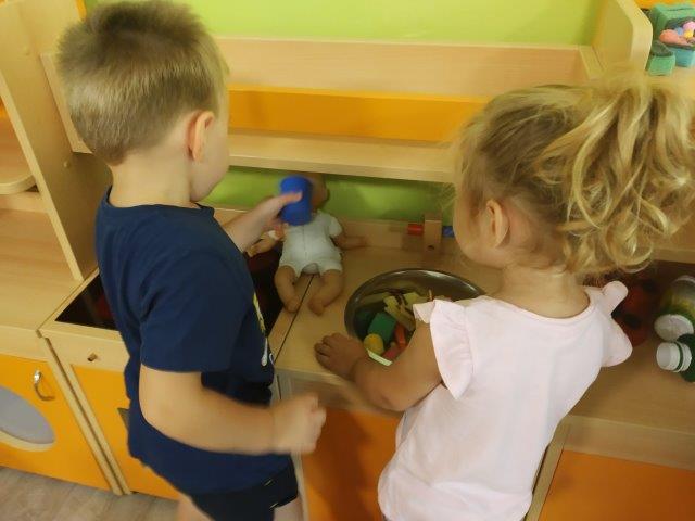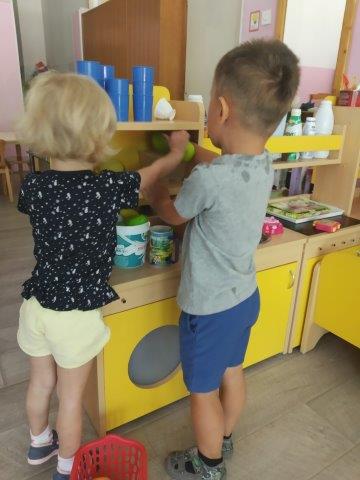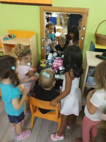 Djeca iz različitih skupina ostvarila su interakciju putem imitativnih igara u obiteljskom kutiću, kutiću frizera, kutiću majstora. Djeca su kroz igre pretvaranja međusobno surađivala, ostvarivala komunikaciju, nadograđivala igru. Odgojiteljice su igru djece obogatile p.n.m-om (toaletni tuljci, razne kutije, čepovi) te rastresitim materijalom (tjestenina) te domaćim plastelinom).