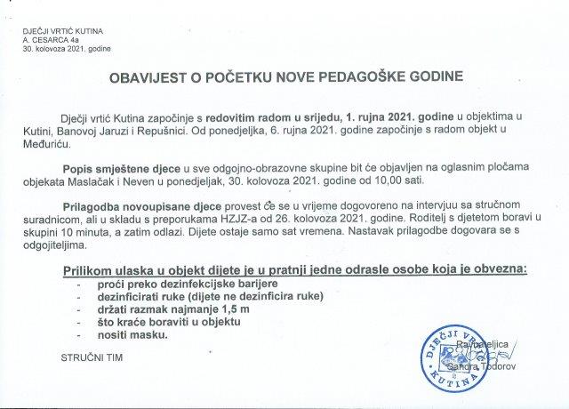 OBAVIJEST O POČETKU NOVE PEDAGOŠKE GODINE 30.8.2021. Upute za sprječavanje i suzbijanje epidemije bolestiCOVID-19 vezano uz rad predškolskih ustanova osnovnih i srednjih škola u školskoj godini 2021./2022.