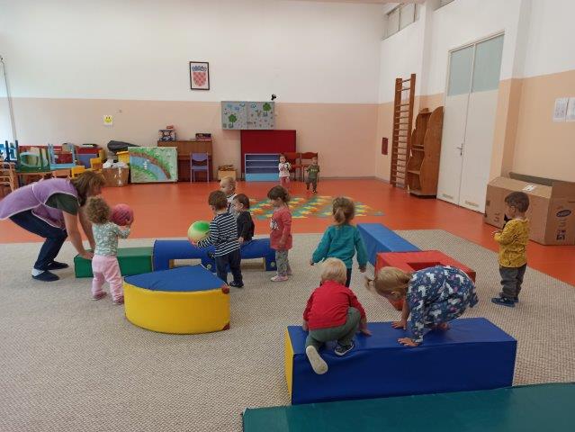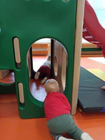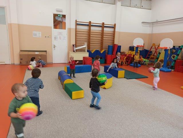Djeca II. jaslica objekta Maslačak svakodnevno razvijaju grubu motoriku kroz prirodne oblike kretanja – puzanje, hodanje, trčanje, skakanje, penjanje, provlačenje, vučenje i guranje. Prvi puta upoznali su prostor vrtićke dvorane i oduševili se! Puno prostora za slobodno trčanje, meke podloge za valjanje, puno lopti za bacanje, WESCO elementi za penjanje i provlačenje i još puno, puno rekvizita i aktivnosti koje ćemo upoznavati kroz godinu.