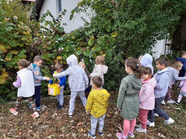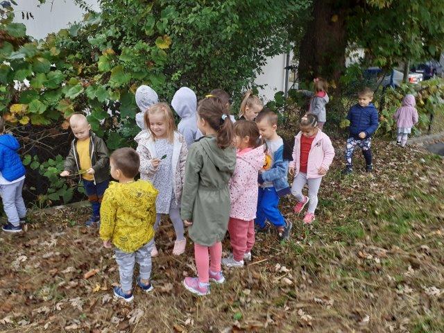 U prvoj ovogodišnjoj šetnji djeca su nabrala raznobojno lišće te uz pomoć odgojiteljice provela eksperiment Tkanina mijenja boju. Strpljivo su čekala što će se dogoditi nakon što lišće pusti klorofil. Gotovo svakodnevno su bilježila i promatrala promjene. Lišće su promatrala i pod grafoskopom te ga slikala i crtala kombiniranom tehnikom akvarela i flomastera. Promjene u biljnom i životinjskom svijetu koje se zbivaju u jesen djeca promatraju neposredno, odlaskom u šetnje širom okolicom vrtića te njihovim uočavanjem i opisivanjem.