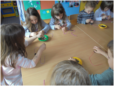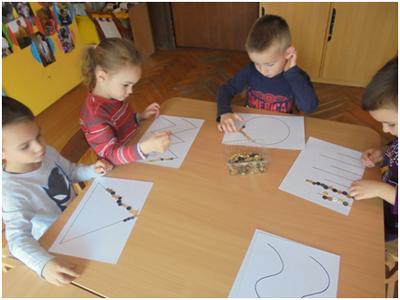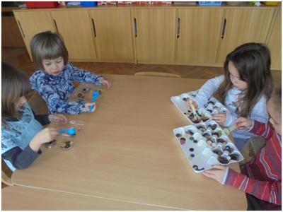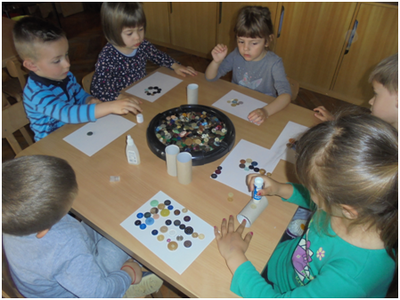 Djeca mlađe skupine objekta Košuta rado se igraju sitnim materijalima. Za igru im nudimo i gumbe raznih veličina, oblika i boja. Manipulirajući njima razvijaju finu motoriku šake, mišljenje, koncentraciju, pažnju, djeca uče razlikovati i imenovati boje, odnose i oblike.