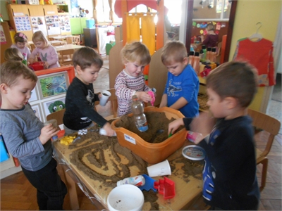 Soba dnevnog boravka i terasa naše skupine imaju pogled na igralište. Kako su djeca, boraveći na terasi ili gledajući kroz prozor, često ispitivala kada ćemo opet ići na pješčanik, donijele smo pijesak u sobu. U likovnom kutiću smo im ponudile, uz mokar i suhi pijesak, piljevinu i grančice te razne plastične boce, čaše, posude, poklopce, školjke. Djeca su pokazala veliki interes i zaključivala: što je mokro – suho, puno – prazno, teško – lako, što odleti kada puhnemo i slično. Pravila su ceste, tunele, kolače, torte i uživala u igri.