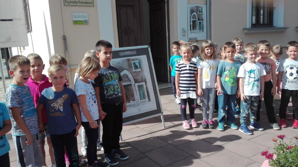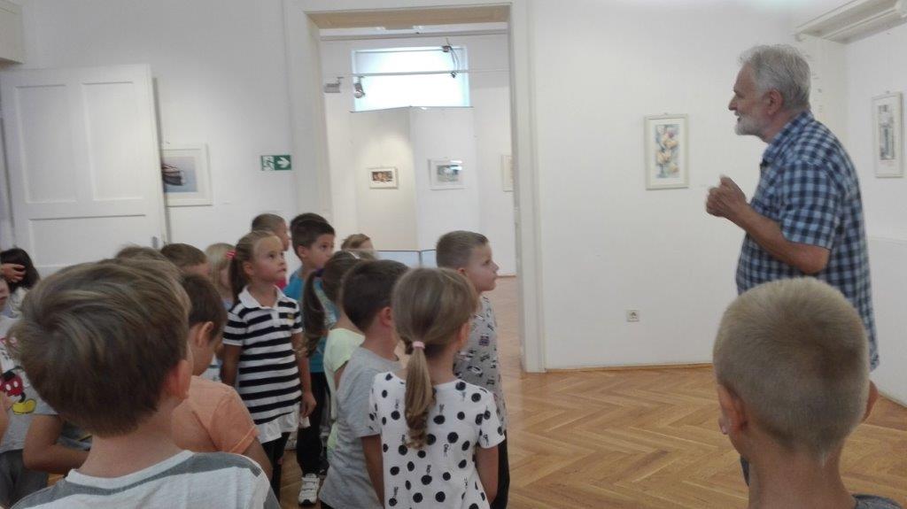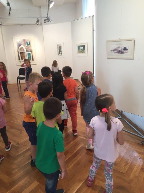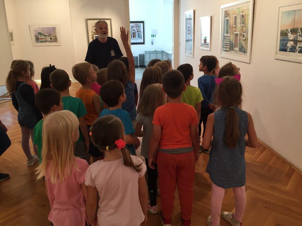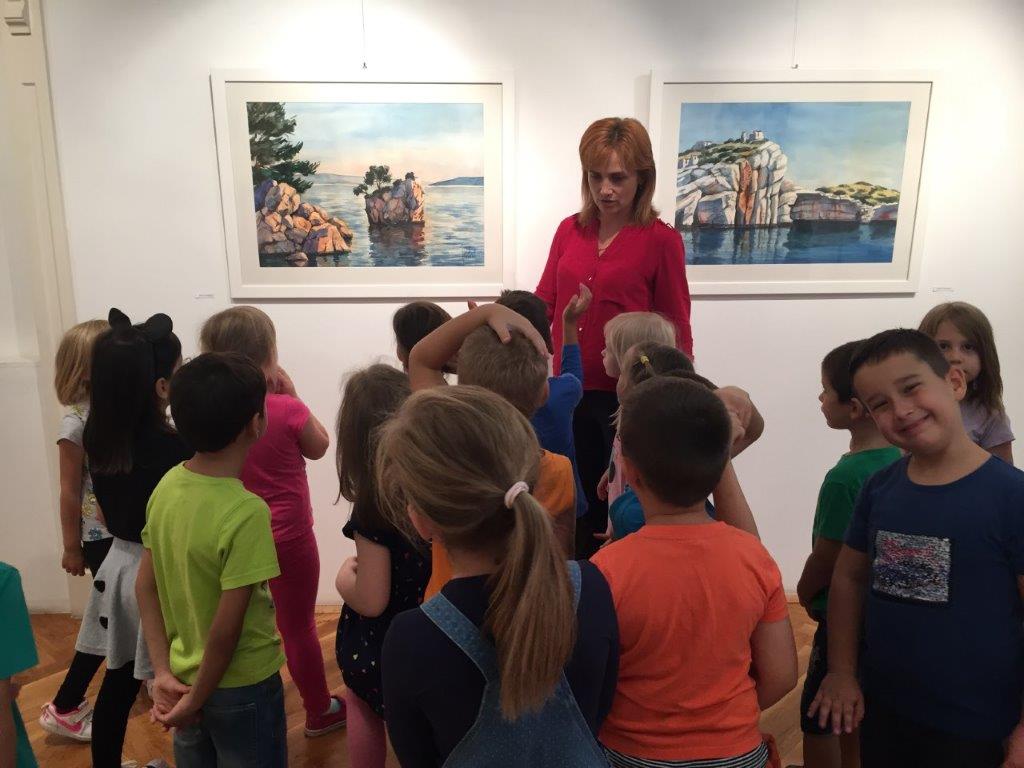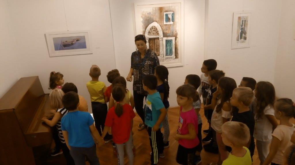 Posjet Galeriji 13.9.2018. Djeca starijih skupina objekta Maslačak posjetila su likovnu izložbu slikara Nevena Jakovljevića. Razgledavali su likovne radove morskih motiva slikane akvarelom. Kroz izložbu ih je proveo kustos prof. Mladen Mitar.