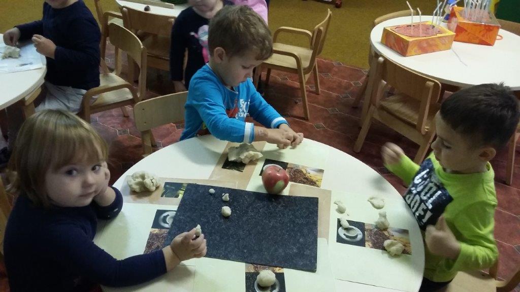 Nakon početnog promatranja, istraživanja oblika i tekstura te imenovanja plodova, odgojiteljice su svakodnevno osmišljavale nove, djeci zanimljive aktivnosti. Kod djece se osim navedenog razvijao govor pjevanjem prigodnih pjesmica : „Kruška, jabuka, šljiva“, „Jula i jabuka“, „Mali bratec Ivo“, izgovaranjem brojalice „Boc, boc iglicama“ te čitanjem slikovnice „Jabuka“.