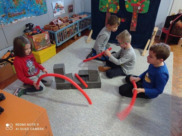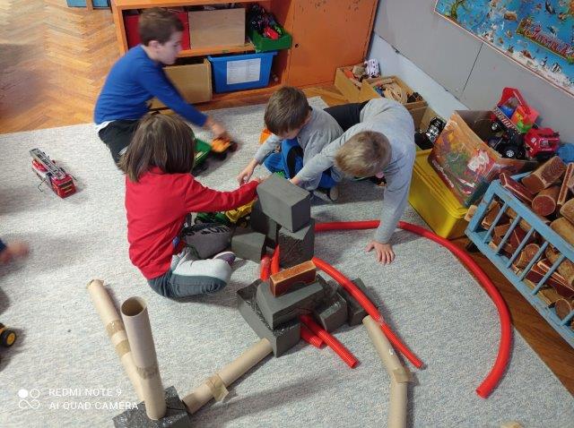 Nedavna jaka kiša koja je prouzročila i kratkotrajnu poplavu po gradu i oko vrtića nas je potakla na razgovor o odvodnim i vodovodnim cijevima, ali i igru u kutiću građenja. Djeca su od raznih cijevi i spužvastih elemenata osmislila kako voda putuje ispod grada. Dovezli su i razna radna i interventna vozila te zajedno rješavali „problem poplave".