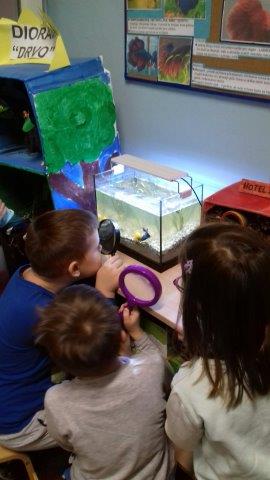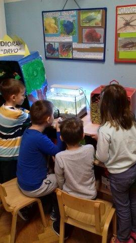 U našoj skupini udomili smo akvarijsku ribicu kojoj su djeca nadjenula ime “Dora” jer ih podsjeća na lik iz animiranog filma. Uz ribicu u akvariju su i dva puža jabučara i tri coridorasa. Svako od njih ima važnu ulogu u održavanju kvalitete života u akvariju.