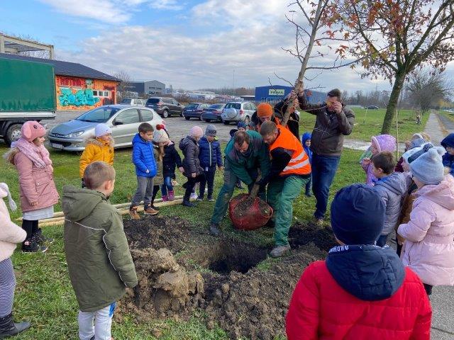 Djeca su pomogla gradonačelniku Grada Kutine g. Zlatku Babiću podignuti sadnicu stabla i zatrpati ju zemljom.
