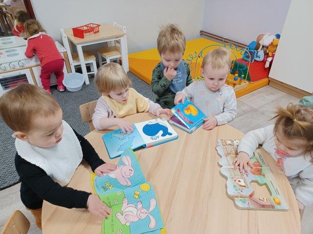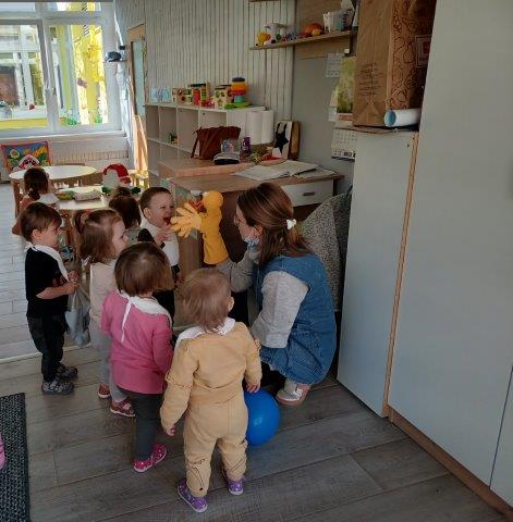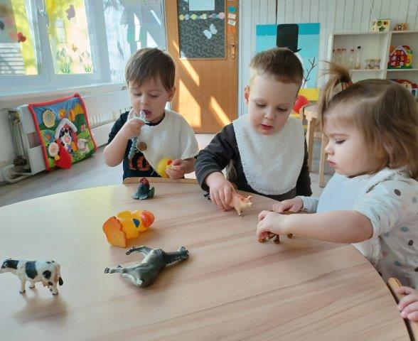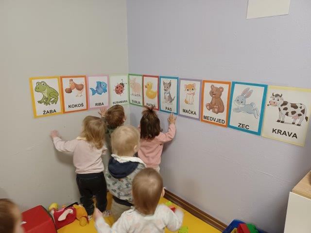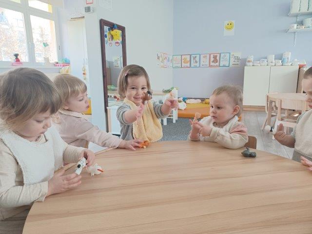 U našoj skupini trenutno se provodi mali sklop aktivnosti na temu upoznavanja životinja. Uz slikovnice, na navedenu temu djeci su ponuđeni i slikovni prikazi životinja koji ih potiču na prepoznavanje, pokazivanje i imenovanje. Usporedno s prepoznavanjem životinja djeca se upoznaju i s njihovim načinom kretanja i glasanja što provodimo kroz svakodnevne tjelesne aktivnosti. Kako bi obogatile dječju igru prikupile smo plišane i gumene životinje s kojima djeca ostvaruju igru nježnosti i brige. Također, vrlo zanimljiva aktivnost im je manipulacija lutkicama namijenjenima za prste te ih svakodnevno natiču na prste svoje ruke, ali i prste vršnjaka i odgojitelja. Starija djeca prepoznaju većinu životinja, imenuju ih i oponašaju glasanje istih, dok mlađa djeca prepoznaju životinje pokazujući na njih i oponašajući njihovo kretanje. Osim prethodno navedenih aktivnosti, uz scensku lutku patke prisjećamo se poznatih pjesmica i brojalica, ali i usvajamo nove poput „Pliva patka preko Save“.