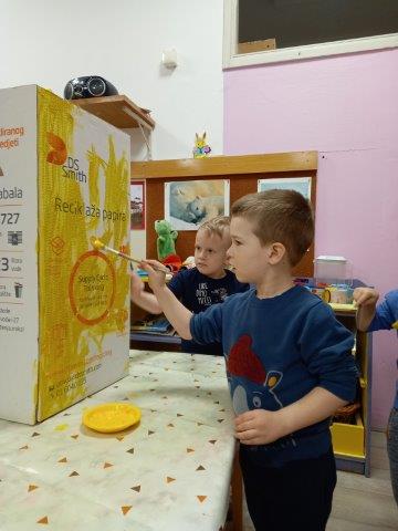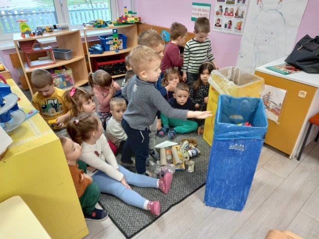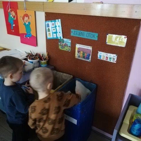U sobi odgojne skupine postavili smo mali Zeleni otok. Djeca su obojila velike kartonske kutije u koje odvajamo otpad. Za sada su to kutije za papir i plastiku. U igri i aktivnostima djeca koriste razni pedagoški neoblikovani materijal koji nakon upotrebe odvajaju u odgovarajući spremnik (kartonske rolice, prazna ambalaža proizvoda...) Kroz tematske eko slikovnice te didaktičke igre djeca uče o važnosti odvajanja otpada te kako brinuti o prirodi i okolišu.