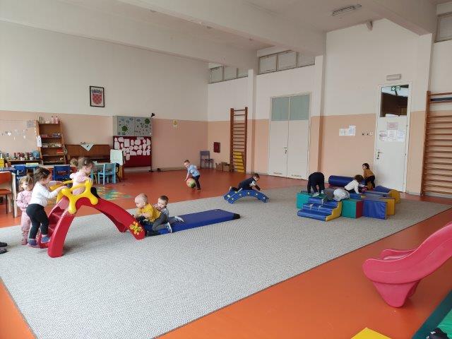 Nekoliko puta tjedno idemo u vrtićku dvoranu gdje se spuštamo niz tobogan, igramo u igluu, gađamo koš loptama ili se igramo lovice, a ponekad lovimo i odbjegle obruče po cijeloj dvorani. Dolaskom lijepog vremena sve više aktivnosti provodimo vani. Šećemo okolinom vrtića ili se igramo na igralištu. Djeca se odlascima van posebno vesele!