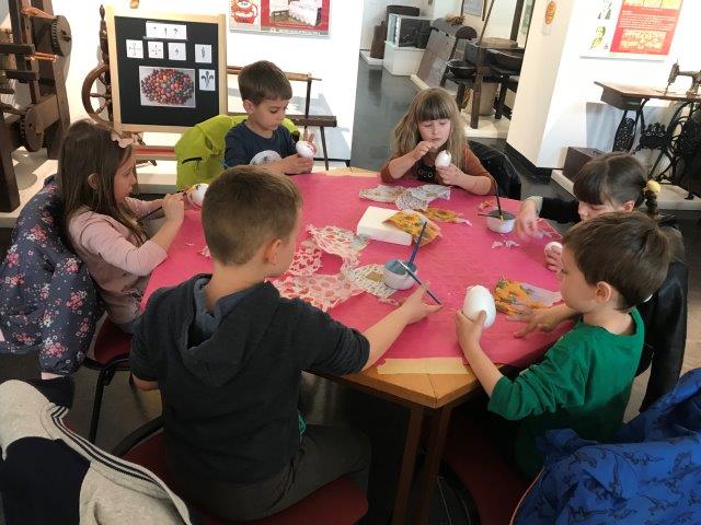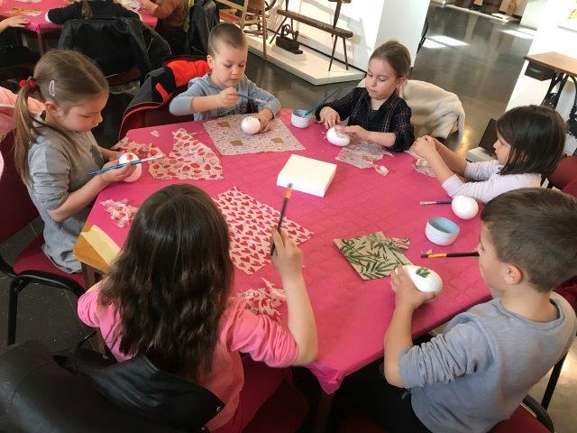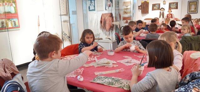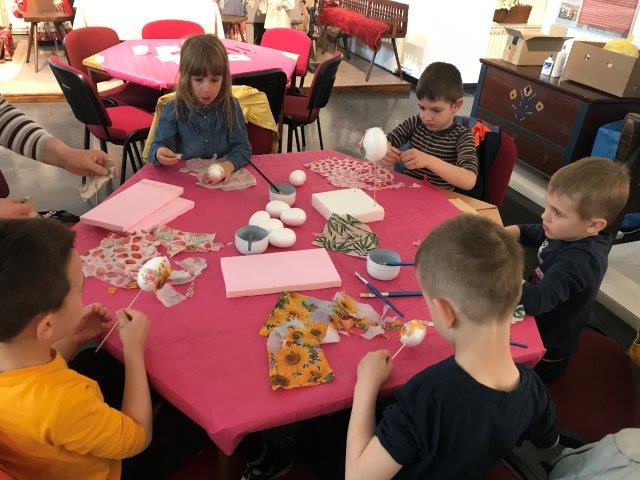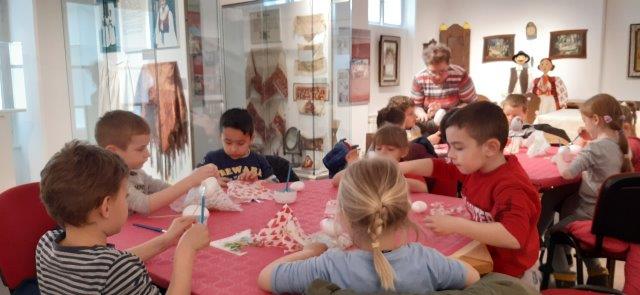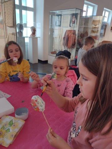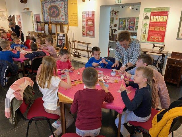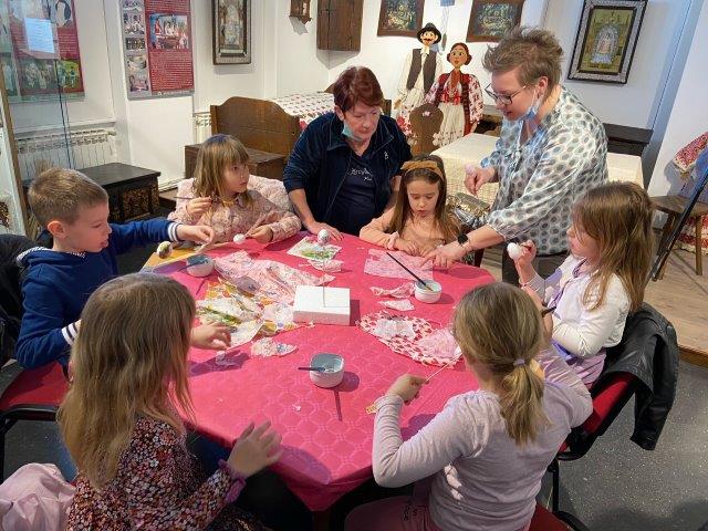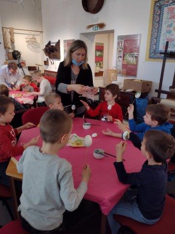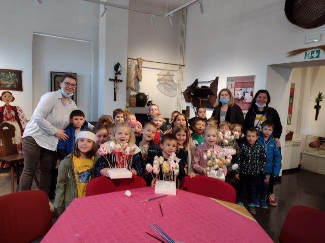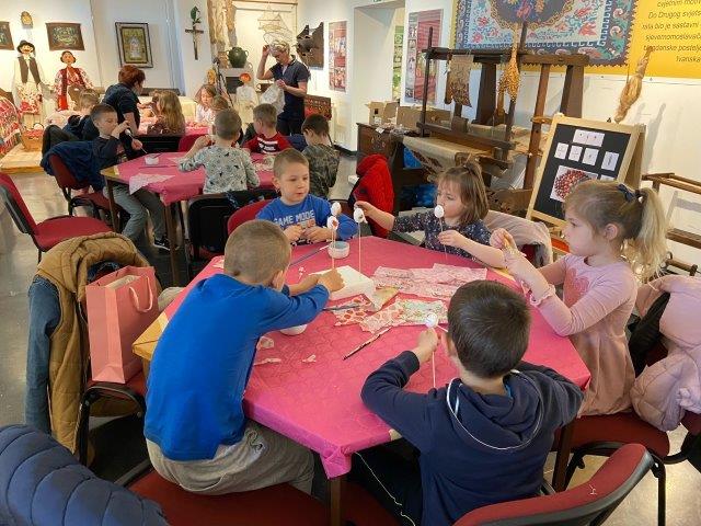 Djeca starije A i B skupine Nevena, starije B i C skupine te srednje D skupine Maslačka sudjelovala su u Muzeju Moslavine na radionici ukrašavanja pisanica. Djeca su pisanice ukrašavala dekupaž tehnikom. Vrlo pažljivo i ustrajno su lijepili male dijelove salveta na jaja od stiropora te oduševljeno pokazivali svoje uratke. Šarenim pisanicama smo