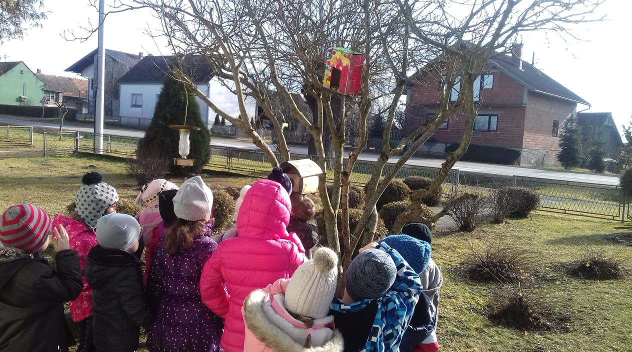 Igrajući se u dvorištu vrtića djeca su pronašla pero od ptice i bili puni pitanja: „Od kuda je to pero palo?“, „ Gdje su ptice?“, „Što jedu?“ . Pronađeno pero promatrali su s povećalom te je tako i započela naša aktivnost o pticama. Djeca su izradila kućicu za ptice i hranilicu od pedagoški neoblikovanog materijala, koju smo stavili na drvo ispred vrtića. Pri izradi kućice za ptice djeca su imala razne izjave i prijedloge: