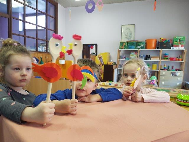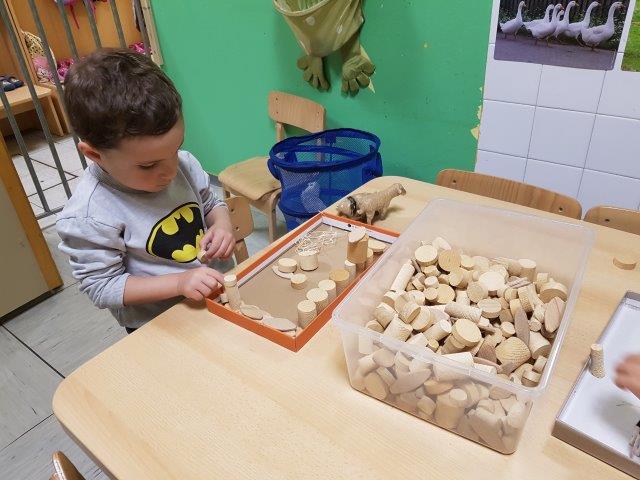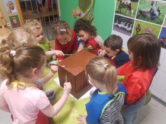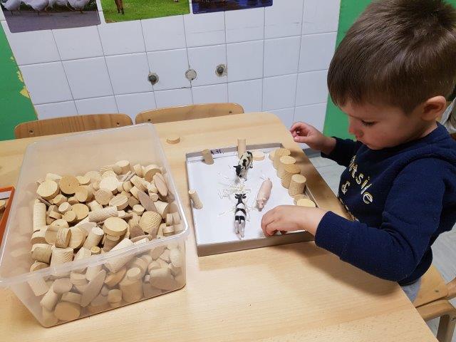 Drveni materijal koji su nam poklonili roditelji Vinke Horvat i figure domaćih životinja djecu su potaknuli na građenje nastambi. Kako bi djeca proširila spoznaje i stekla nova znanja omogućile smo im raznolike poticaje: velike fotografije domaćih životinja, razne slikovnice, cd s glasanjem životinja, figure životinja, razne građevne materijale. Tako su djeca svakodnevno bogatila i širila rječnik prepoznavanjem i imenovanjem životinja, mladunaca i nastambi. Puzzlama od dva dijela djecu smo poticale na rješavanje zadataka: povezivanje i imenovanje majke i mladunca. Drvene špatule koje su nam poklonili roditelji Eve Horvatović i kartonska kutija koje su djeca sama pobojala temperama poslužili su nam za izradu staje za životinje. Djeca staju često koriste za razne imitativne igre. Putem scenske igre „Sretna obitelj“ i lutaka na štapu: pijevca, kokoši i pilića djecu smo poticale na govorno stvaralaštvo.
