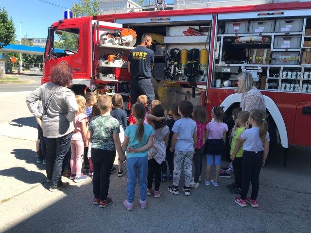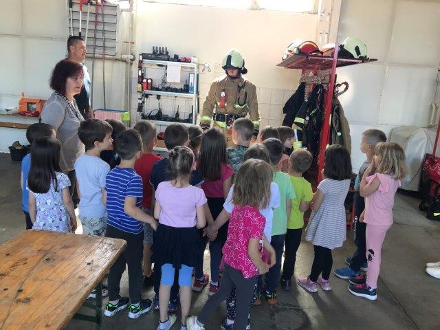 Djeca srednje D skupine objekta Maslačak posjetili su vatrogasnu postaju Kutina. Vatrogasci su djeci opisali i pokazali od čega se sastoji vatrogasno odijelo te su neke dijelove mogli i isprobati. Zabavno je bilo čuti i vidjeti zvučne i svjetlosne alarme koji obavještavaju vatrogasce o sljedećoj akciji te pozivni centar. Djeca su imala priliku držati crijevo i uživjeti se u ulogu vatrogasca te mlazom vode gađati limenke. Upoznali su vatrogasna vozila i što sve u njima ima.