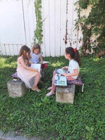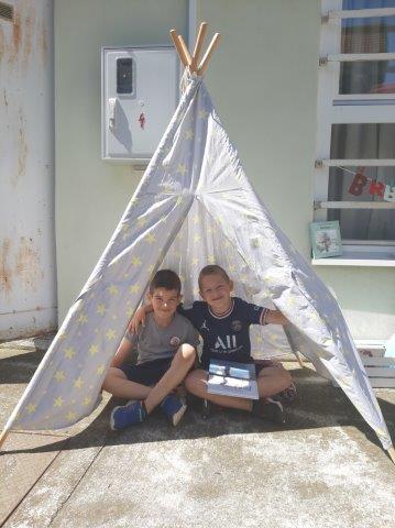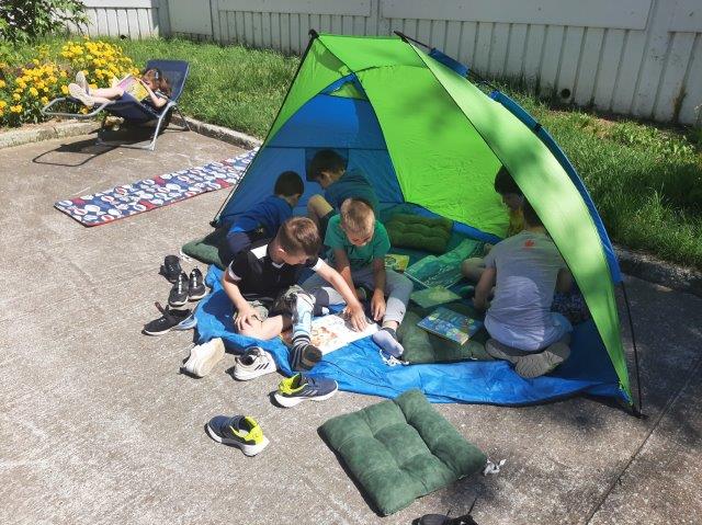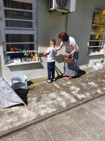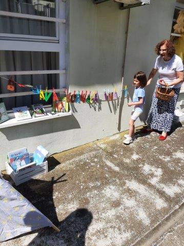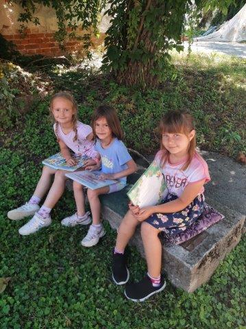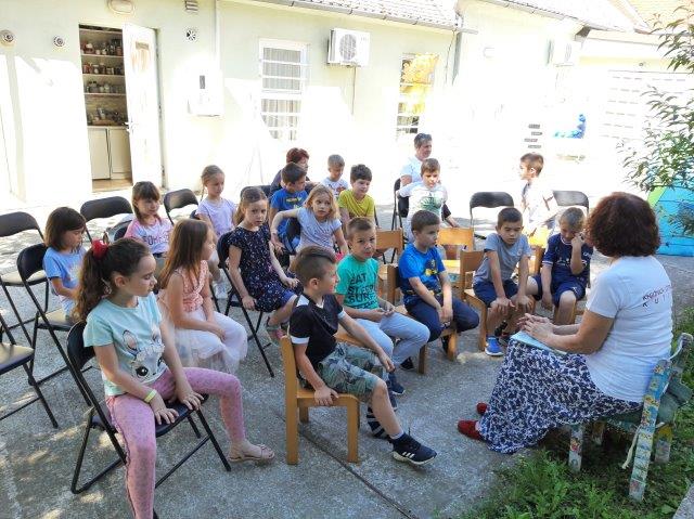 Na otvorenom prostoru uz Knjižnicu i čitaonicu djeca starije C skupine poslušala su priču "Brbljava kornjača". U ugodnom ljetnom ambijentu (šatori, ležaljke,...) djeca su nakon priče odigrala zanimljivu igru slovima te razgledavala slikovnice.