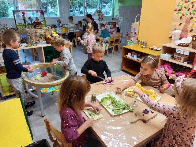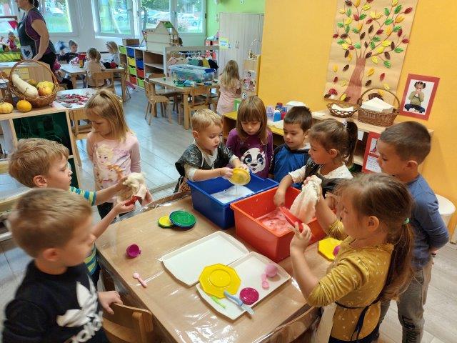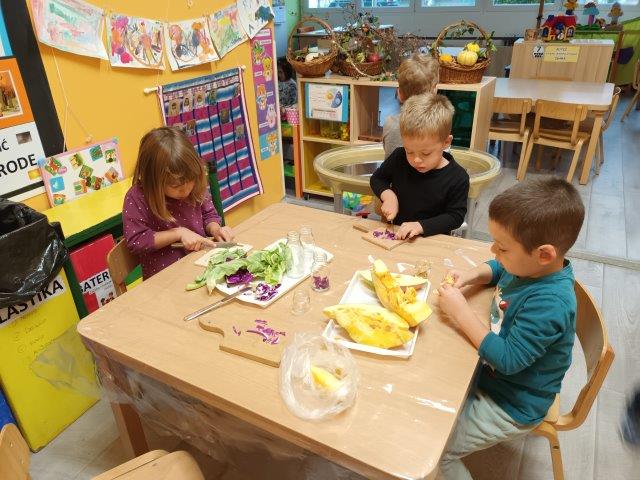 Mala znatiželja za jesenske plodove pokrenula je lavinu zanimljivih aktivnosti.Tako su djeca sama sortirala, rezala i spremala zimnicu. Nakon što su uočila i spoznala da se nešto neobično dogodilo s našom malom zimnicom, uslijedio je drugi dio igre gdje su djeca trebala uložiti napor oko pranja i brisanja tog istog posuđa. Ovim zanimljivim aktivnostima potičemo dodatna opća znanja, spoznajni razvoj, socio-emocionalne vještine, vizualnu percepciju i finu motoriku.