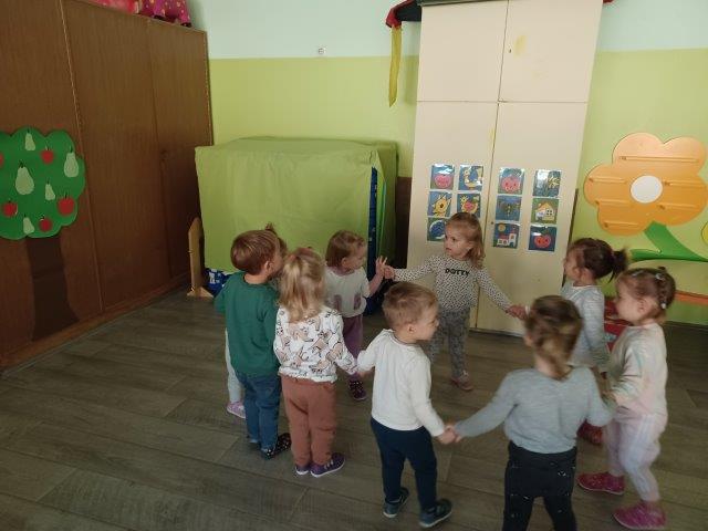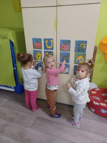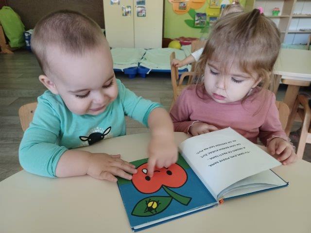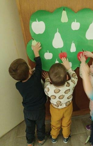 Djeca odgojne skupine II.B jaslica prošlog su tjedna upoznala slikovnicu D. Bruna „Jabuka“ izloženu u obliku priče u slikama. Pažljivo su slušala priču, pokazivala, prepoznavala, imenovala pojmove sa slikovnih prikaza te usvajala izražavanje jednostavnim rečenicama. Priča je bila poticaj djeci na istraživanje oblika, teksture i boje jabuke, ali i njenog okusa tijekom voćne užine. Kao dodatan poticaj na istraživanje izradile smo slikovni prikaz stabla koji potiče razlikovanje kruški i jabuka te prepoznavanje boja i odnosa veličina – veliko / malo. S djecom smo provodile i glazbene aktivnosti od kojih izdvajamo usvajanje pjesmice „Jula i jabuka“ te prisjećanje pjesmica „Mali bratec Ivo“ te „Kruška, jabuka, šljiva“ uz ples u kolu.