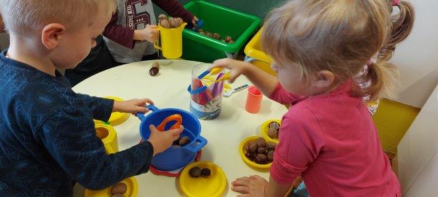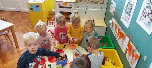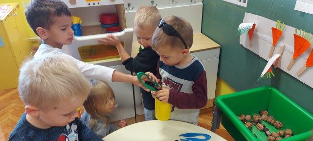 Najveći interes djeca su pokazala za igru u kutiću kuhinje gdje su pretrpavala orašaste plodove iz jedne posude u drugu, premještala ih pincetom i žlicom, te pripremali razna jela za naše lutke.