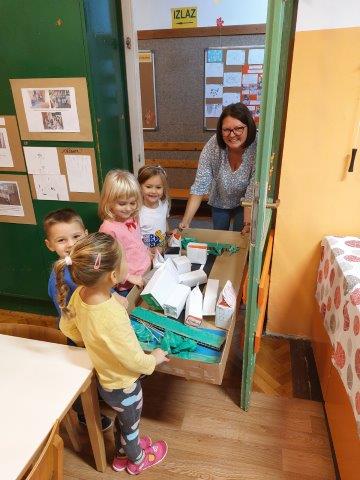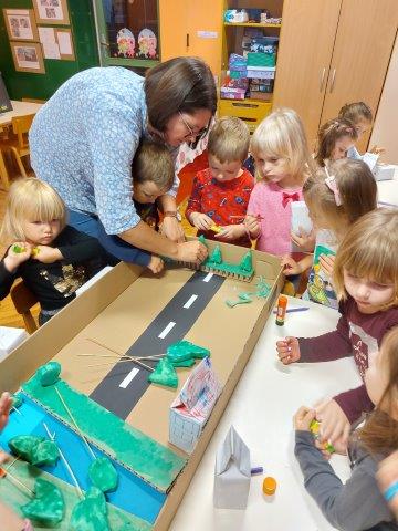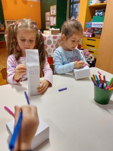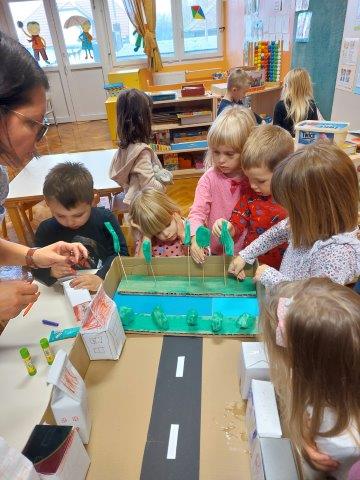 U našoj skupini boravila je Antina majka Kristina Barun koja je za djecu pripremila nekoliko interesantnih aktivnosti. Izradila je maketu našeg grada od kartona te ponudila djeci flomastere kako bi zajedno obojali zgrade i kuće. Pomoću škarica i kolaž papira su u rijeku dodavali ribice i patke, a temperama su bojali drveće i grmlje. Zajedničkom suradnjom su dogovarali na kojem mjestu će se što na maketi nalaziti te su sve zalijepili ljepilom za podlogu. Djeca su rado pristupala svim aktivnostima, a majka je pokazala dobru komunikaciju te suradnju s djecom. Za kraj druženja ponudila je svakom djetetu kartonsku posudicu koju su prema vlastitoj želji obojali temperama i nosili kući, a može im poslužiti za držanje olovaka ili nekih drugih stvari. Zahvaljujemo se i ovim putem majci na lijepom druženju i suradnji!